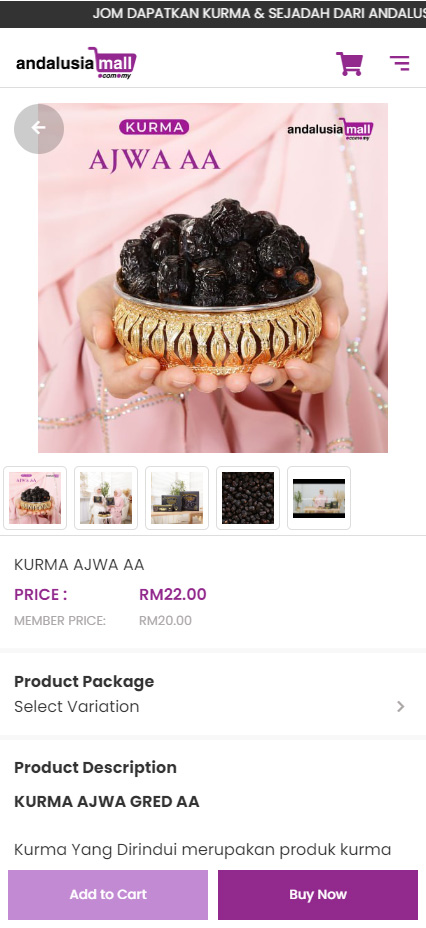 Unique Mall that sells middle eastern sourced products like Kurma and Sejadah. Open to all the customers of Andalusia Group of Companies and also to public. Launched Staff Affiliate program that enables their front office staffs to easily sell the products via individual product link/QR codes.